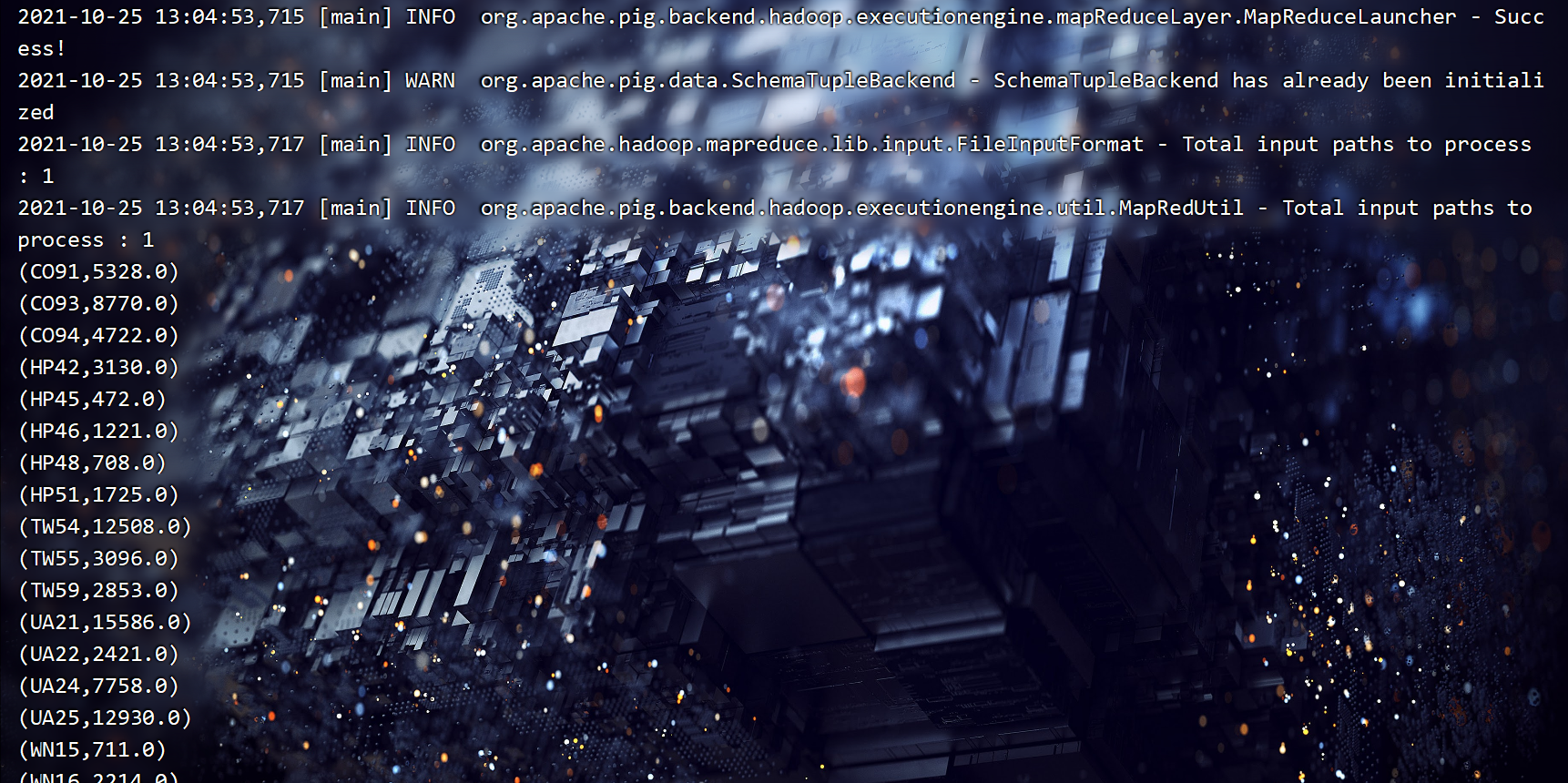 data = load 'hdfs://zbt:9000/user/pig/1987_600.csv' using PigStorage(',') as (Year,Month,DayofMonth,DayOfWeek,DepTime,CRSDepTime,ArrTime,CRSArrTime,UniqueCarrier,FlightNum,TailNum,ActualElapsedTime,CRSElapsedTime,AirTime,ArrDelay,DepDelay,Origin,Dest,Distance,TaxiIn,TaxiOut,Cancelled,CancellationCode,Diverted,CarrierDelay,WeatherDelay,NASDelay,SecurityDelay,LateAircraftDelay);